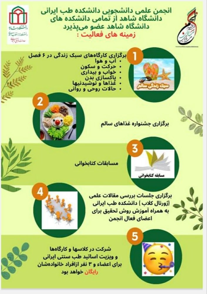 در این پایگاه، زمینههای فعالیت مندرج در پوستر انجمن علمی دانشجویی دانشکده طب ایرانی توسط اساتید و دانشجویان این دانشکده معرفی میشود؛ مشاوره و پاسخ به پرسشهای در رابطه با طب سنتی از دیگر برنامههای این جمع است.