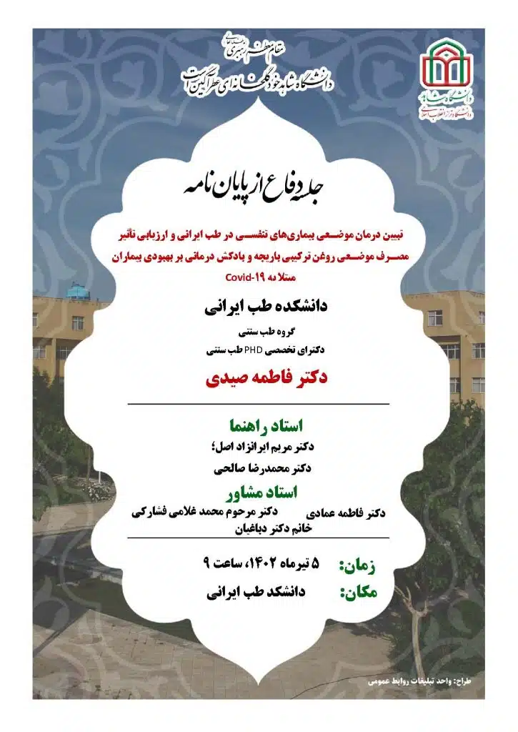 دفاع از پایان نامه خانم فاطمه صیدی، دانشجوی دکترای تخصصی دانشکده طب ایرانی، دوشنبه 5 تیر ماه 1402 ساعت 09:00 در دانشکده طب ایرانی برگزار می گردد.