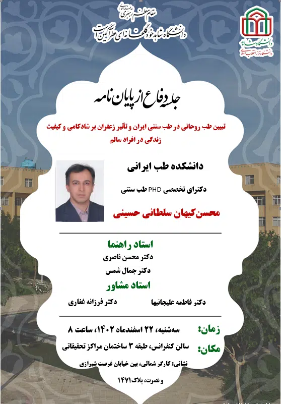 دفاع از پایاننامه آقای دکتر محسنکیهان سلطانی حسینی دانشجوی دکترای تخصصی دانشکده طب ایرانی، روز سهشنبه 22 اسفندماه 1402 ساعت 8 صبح در سالن کنفرانس طبقه سوم ساختمان مراکز تحقیقاتی برگزار میشود.