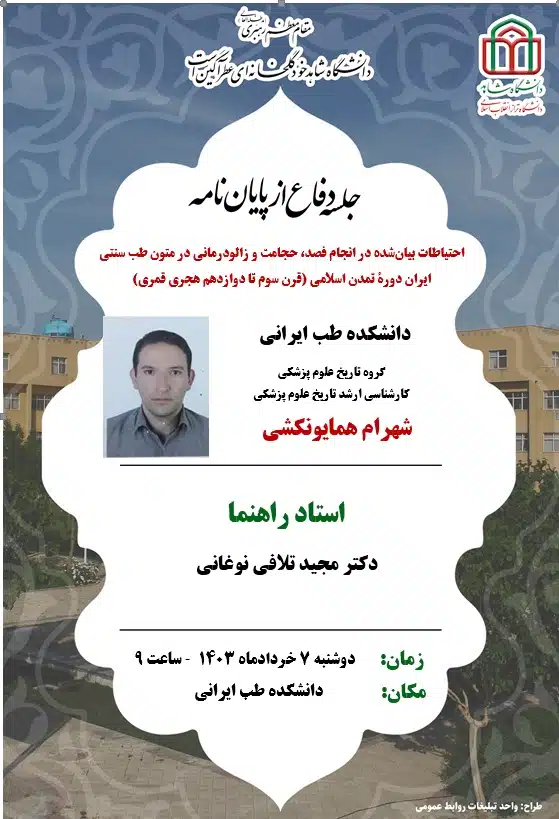 دفاع از پایاننامه آقای شهرام همایونکشی، دانشجوی کارشناسی ارشد دانشکده طب ایرانی، روز دوشنبه 7 خردادماه 1403 ساعت 9 در دانشکده طب ایرانی برگزار میشود.