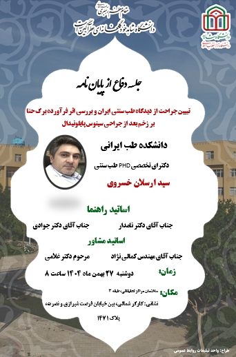 دفاع از پایاننامه آقای دکتر سید ارسلان خسروی دانشجوی دکترای تخصصی دانشکدۀ طب ایرانی، روز دوشنبه 27 بهمنماه 1404 ساعت 8 در ساختمان مراکز تحقیقات دانشگاه شاهد برگزار شد .