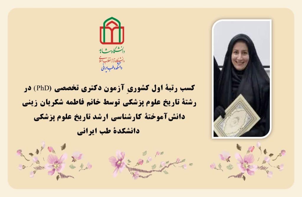 کسب رتبۀ اول کشوریِ آزمون دکتری تخصصی (PhD) در رشتۀ تاریخ علوم پزشکی توسط خانم فاطمه شکریان زینی دانشآموختۀ کارشناسی ارشد تاریخ علوم پزشکی دانشکدۀ طب ایرانی
